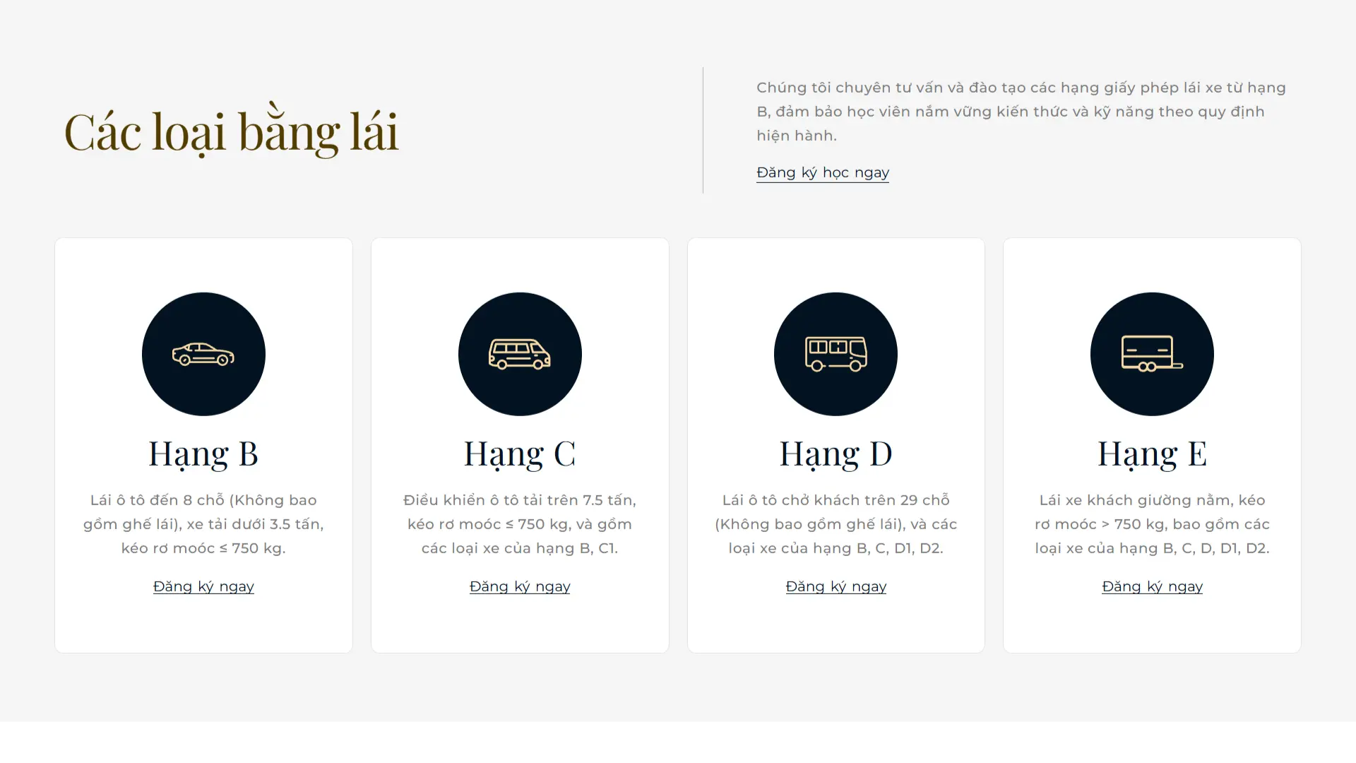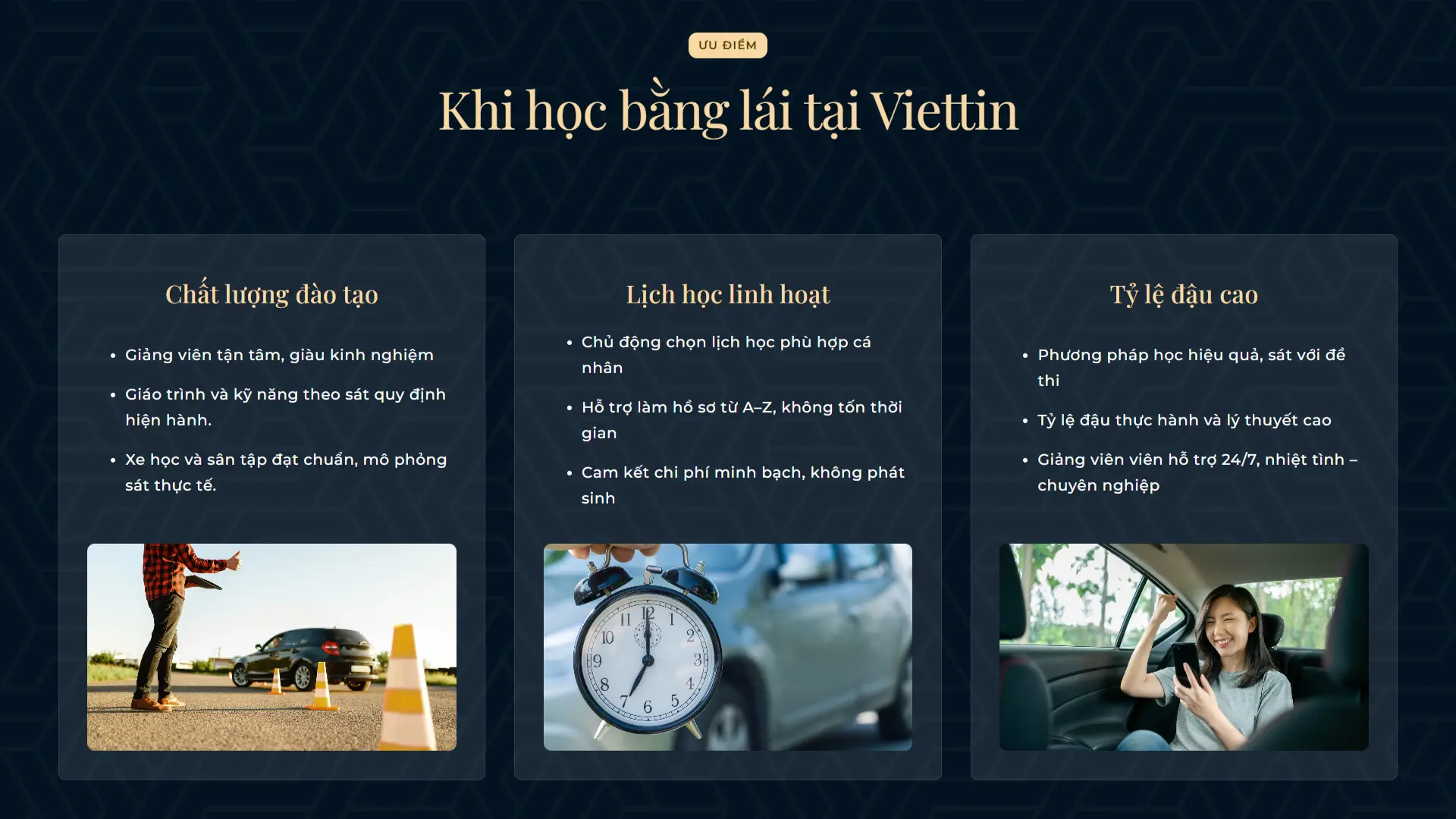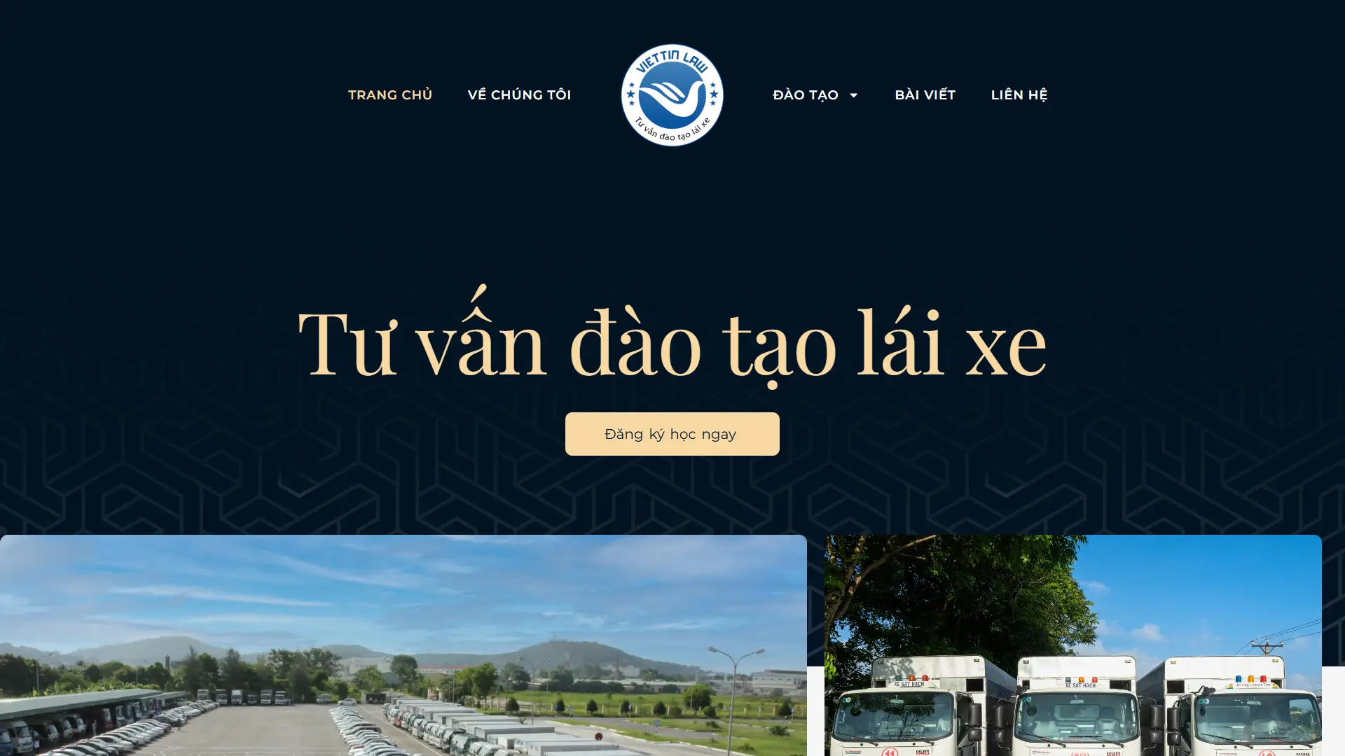 Website sử dụng tông nền xanh đen kết hợp cùng sắc xám tạo nên cảm giác chắc chắn và chuyên nghiệp, phù hợp với lĩnh vực dịch vụ có tính định hướng như đào tạo lái xe. Các tiêu đề màu vàng nhạt đóng vai trò như những điểm nhấn thị giác, mang đến sự thân thiện trong cách truyền tải thông điệp. Việc bo góc hình ảnh giúp giảm đi tính cứng nhắc thường thấy ở giao diện nghiêm túc, đồng thời góp phần xây dựng một bố cục hài hòa, hiện đại và dễ tiếp cận khách hàng hơn.