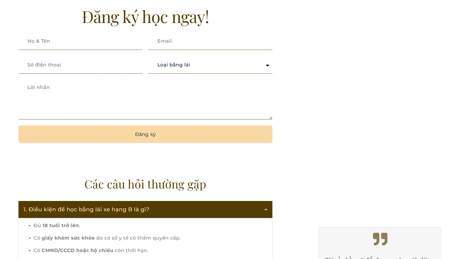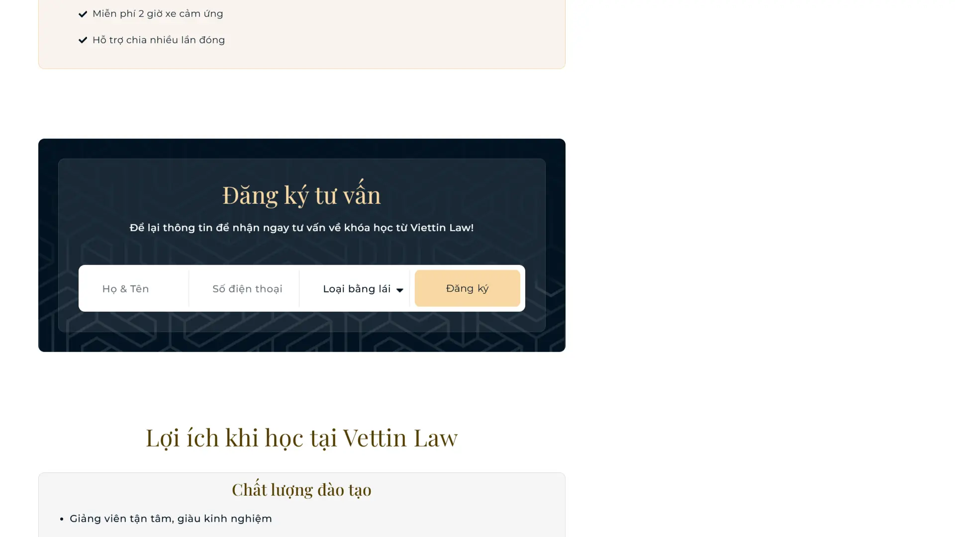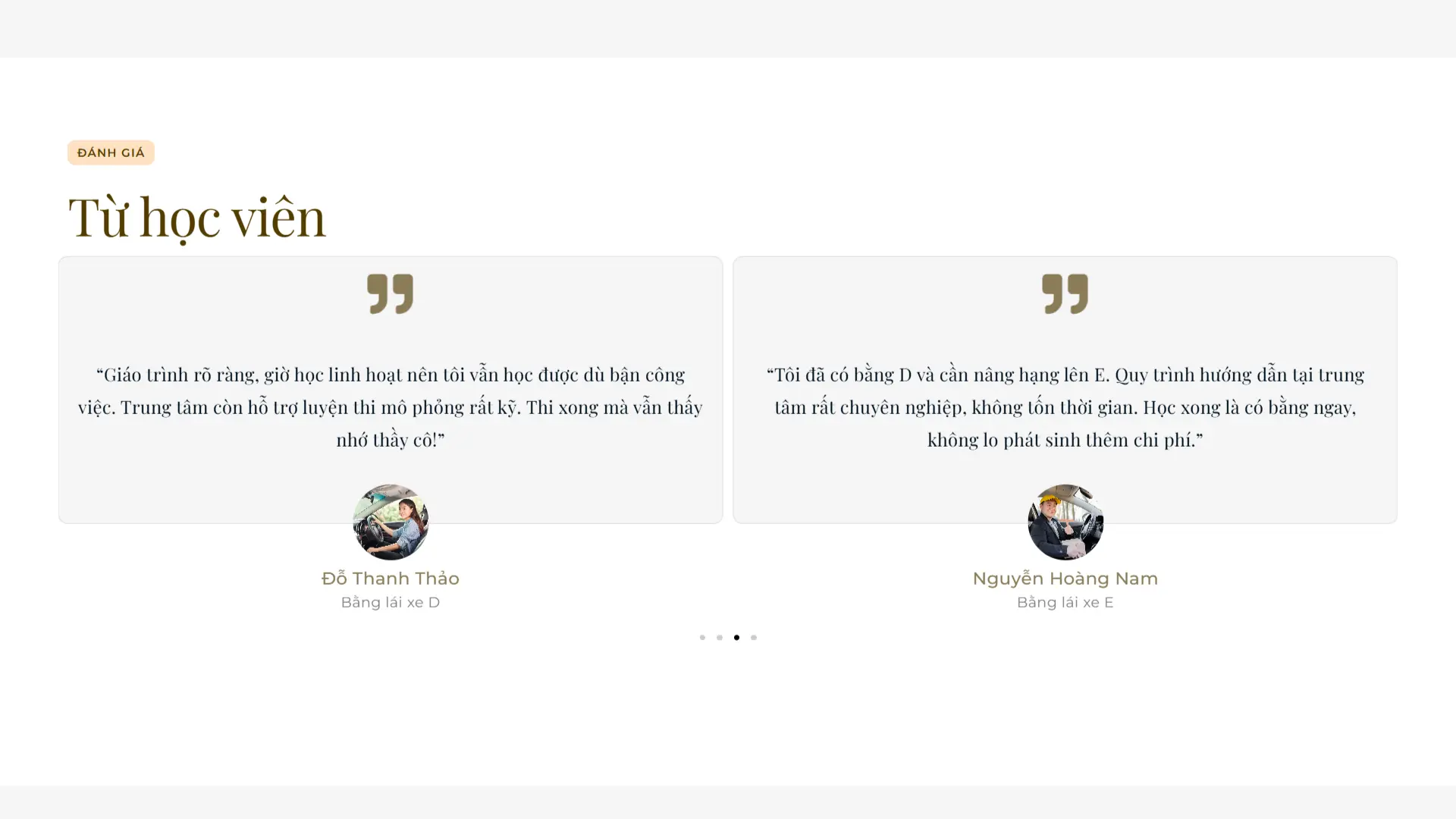 Website sử dụng tông nền xanh đen kết hợp cùng sắc xám tạo nên cảm giác chắc chắn và chuyên nghiệp, phù hợp với lĩnh vực dịch vụ có tính định hướng như đào tạo lái xe. Các tiêu đề màu vàng nhạt đóng vai trò như những điểm nhấn thị giác, mang đến sự thân thiện trong cách truyền tải thông điệp. Việc bo góc hình ảnh giúp giảm đi tính cứng nhắc thường thấy ở giao diện nghiêm túc, đồng thời góp phần xây dựng một bố cục hài hòa, hiện đại và dễ tiếp cận khách hàng hơn.
