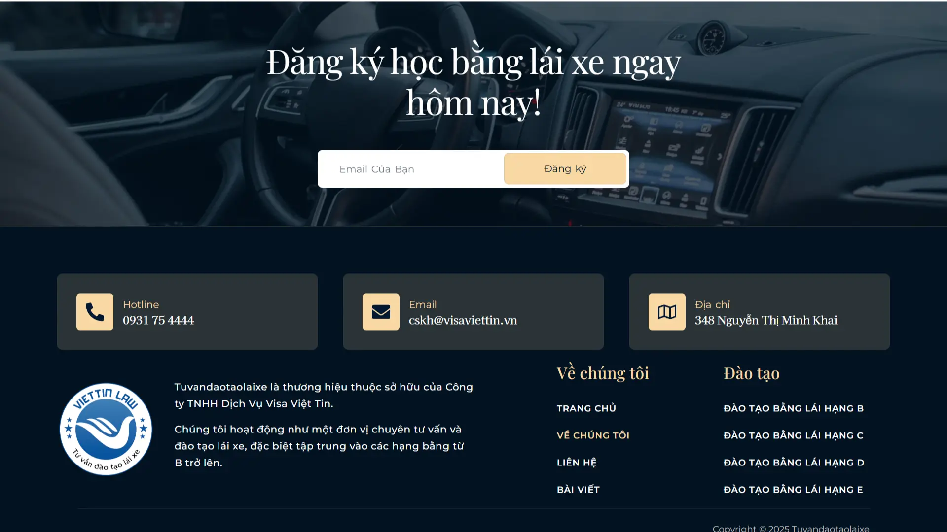“Tư Vấn Đào Tạo Lái Xe” lại là một thương hiệu khác thuộc “Công ty TNHH Dịch Vụ Visa Việt Tin”, hoạt động như một đơn vị chuyên tư vấn và đào tạo lái xe, đặc biệt tập trung vào các hạng bằng từ B trở lên.